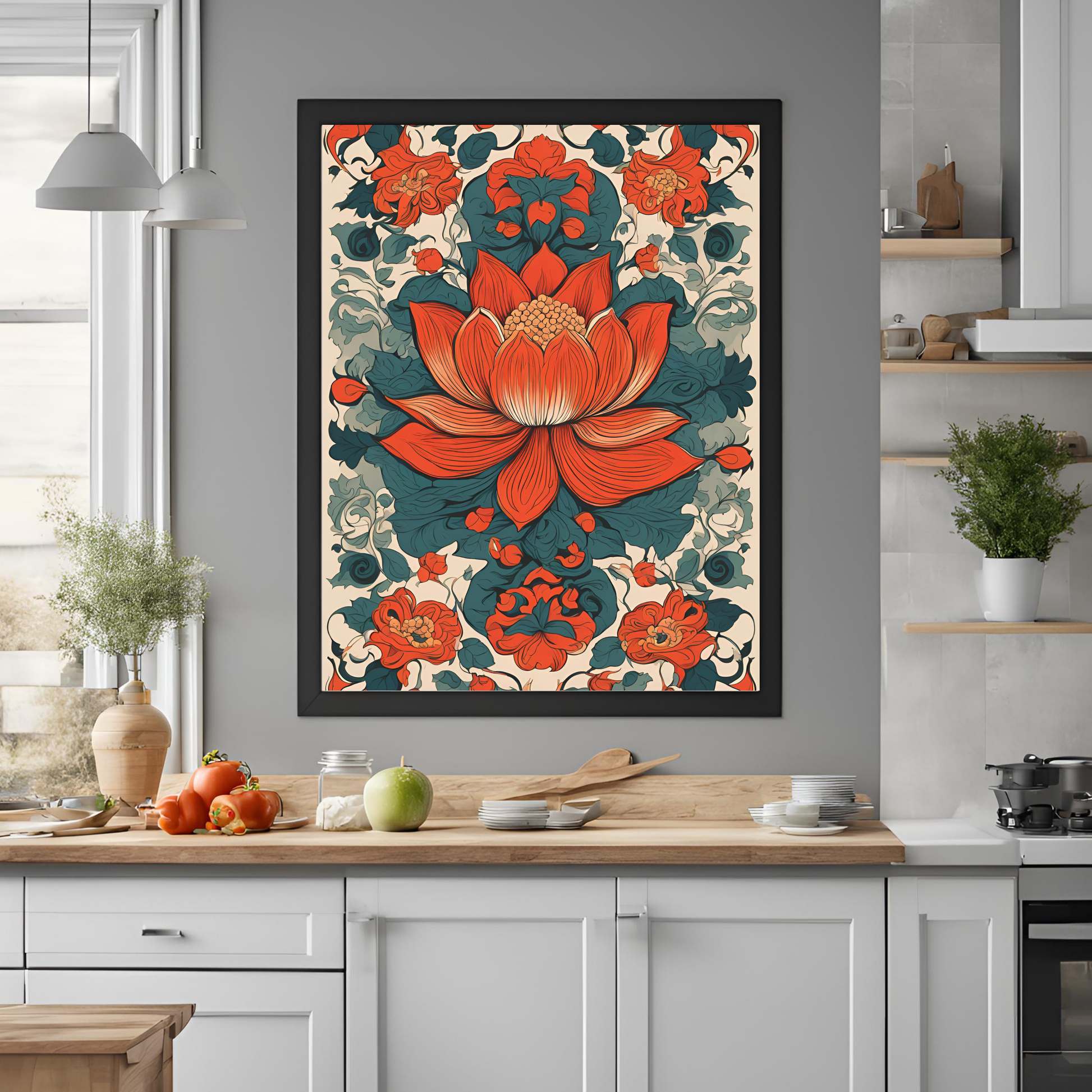 Traditional Folk Art Design: The print showcases the lotus in full bloom, intricately designed in traditional folk art style. The delicate petals and vibrant details symbolize peace, beauty, and spiritual growth, making it a meaningful and eye-catching addition to any room.