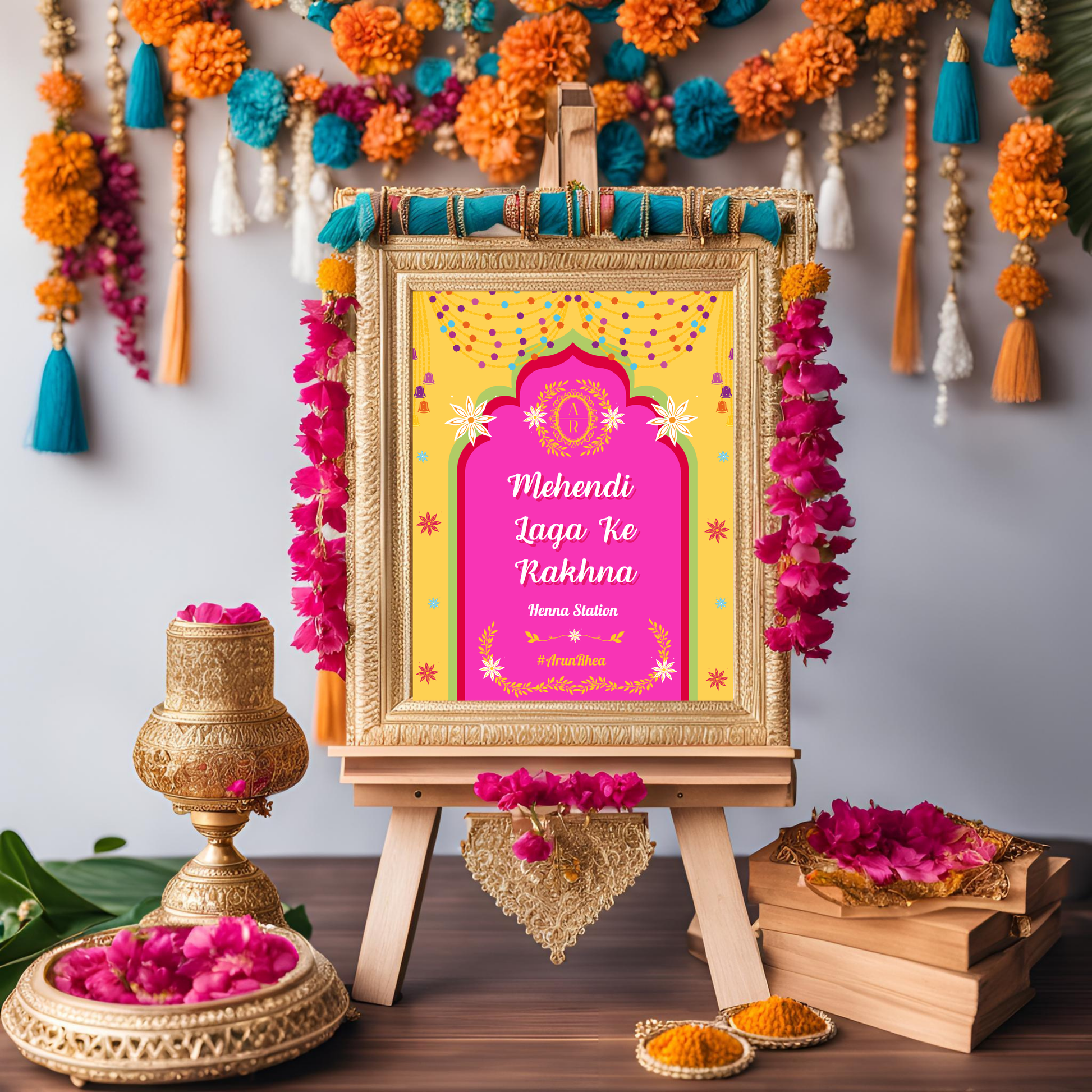 - Bollywood-Inspired Festive Design – Featuring vibrant colors and elegant traditional motifs, this Mehndi signagecaptures the excitement and joy of a wedding celebration.