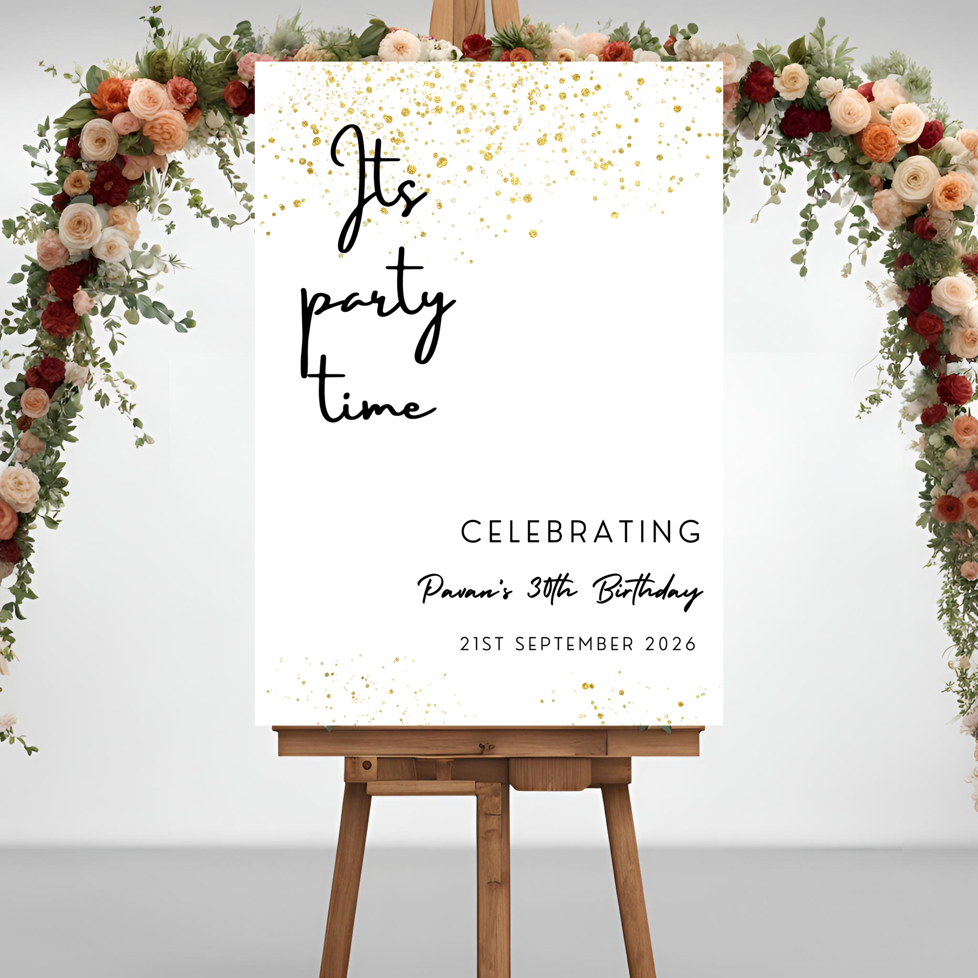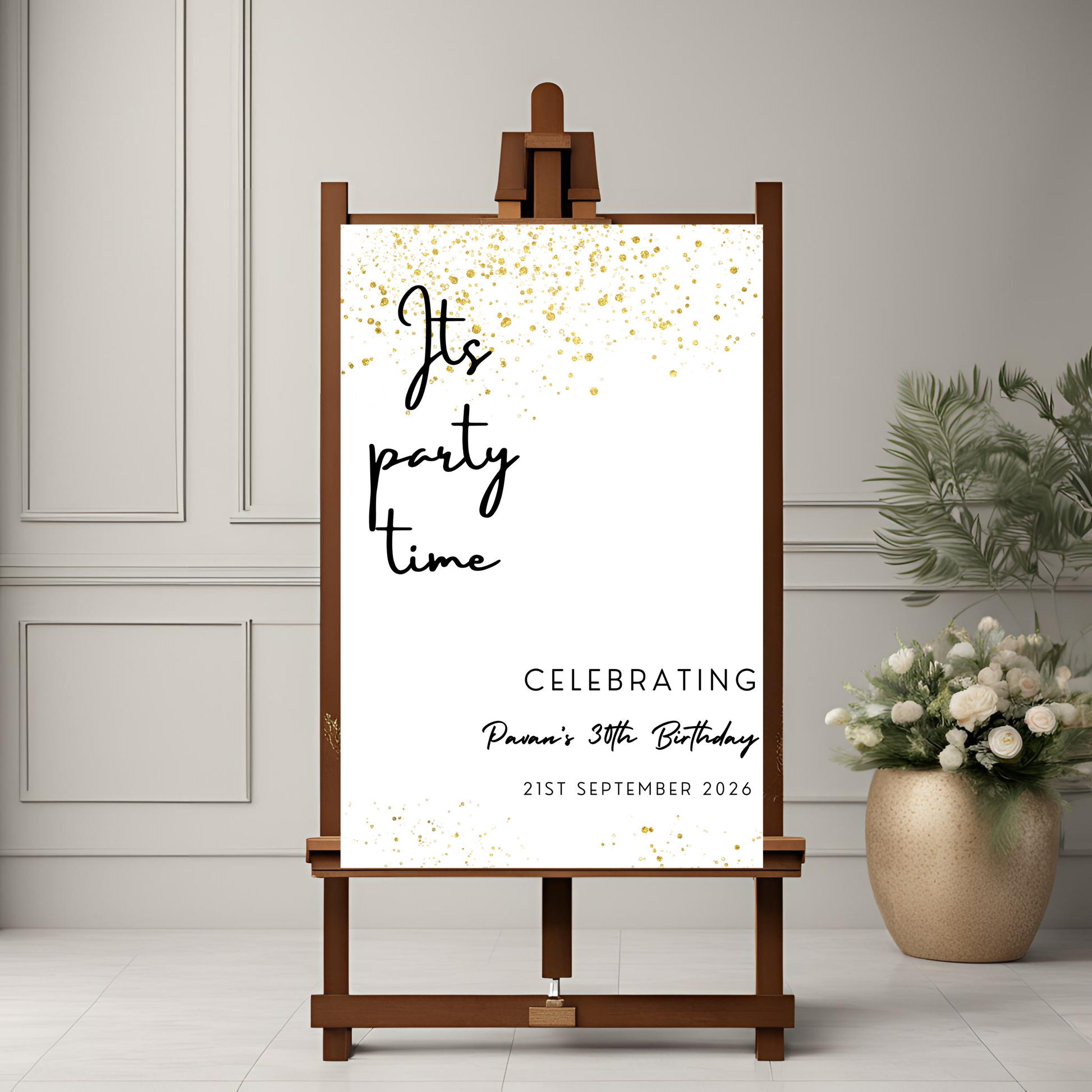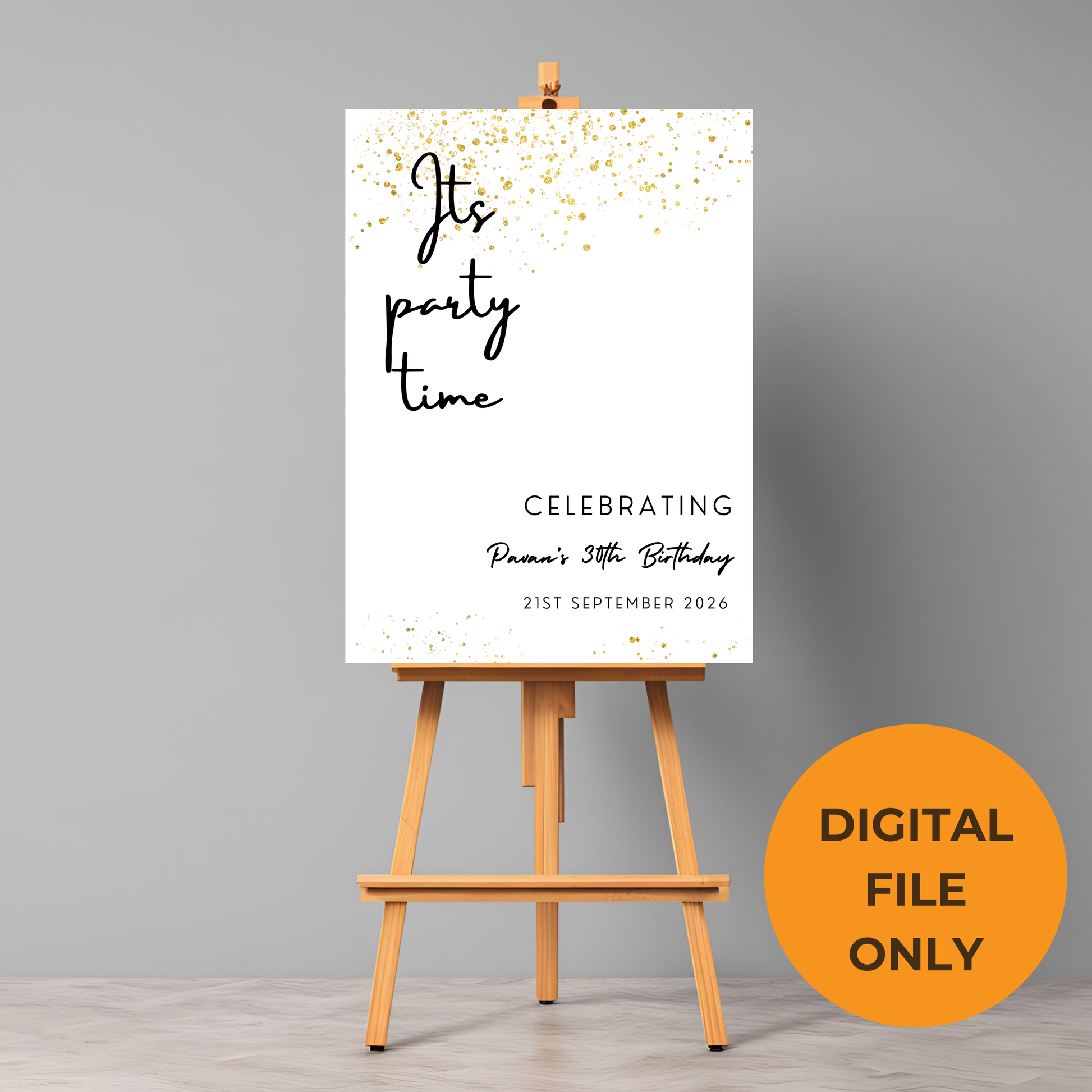Welcome your guests with a touch of sparkle using this Minimalist Gold Glitter Birthday Welcome Sign. Featuring a sleek, modern design with elegant gold glitter accents, this editable template is perfect for setting a celebratory tone at any birthday party. Whether it’s displayed on an easel or used as part of your party decor, this stylish sign is a hassle-free way to make your event unforgettable.
