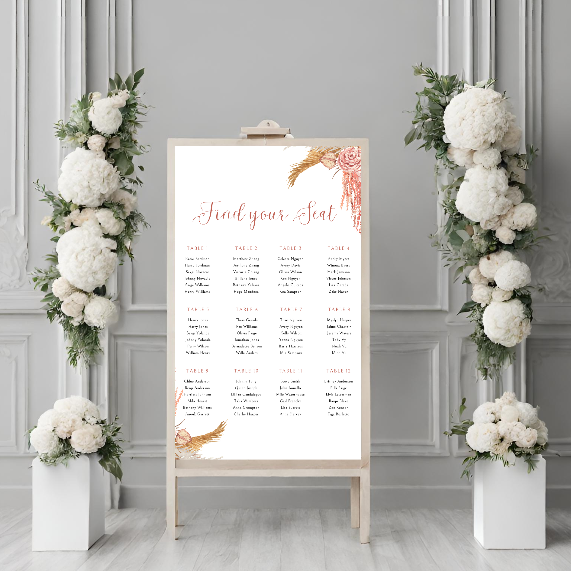 Tailored Personalisation: Elevate your event with a touch of personalisation. Our semi bespoke seating plan allows you to add names, dates, and other details, transforming it into a cherished keepsake that reflects your individual style.
