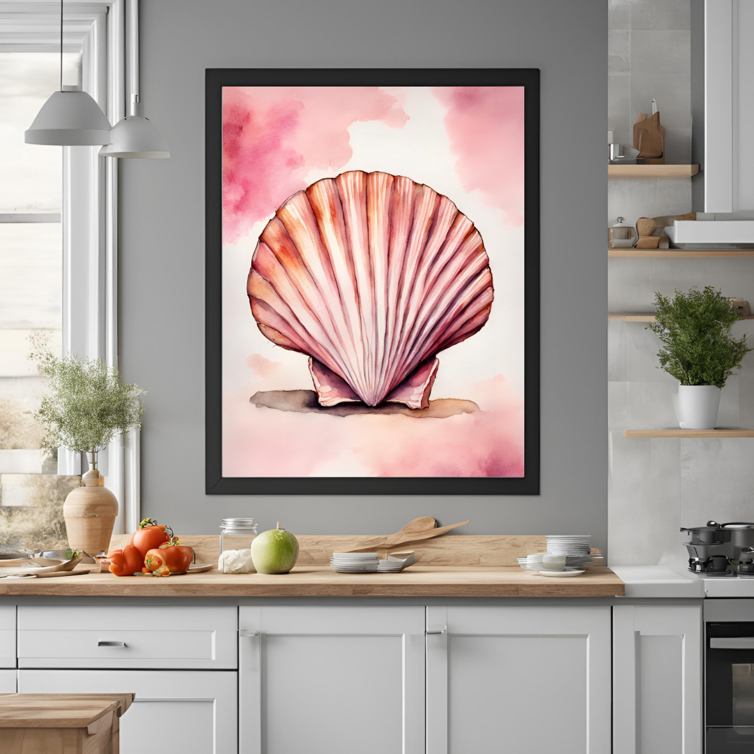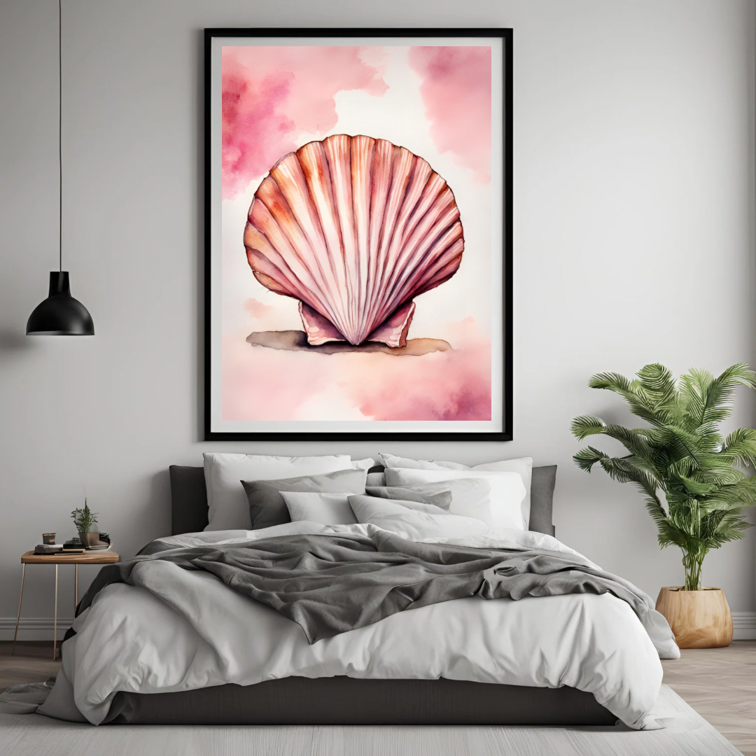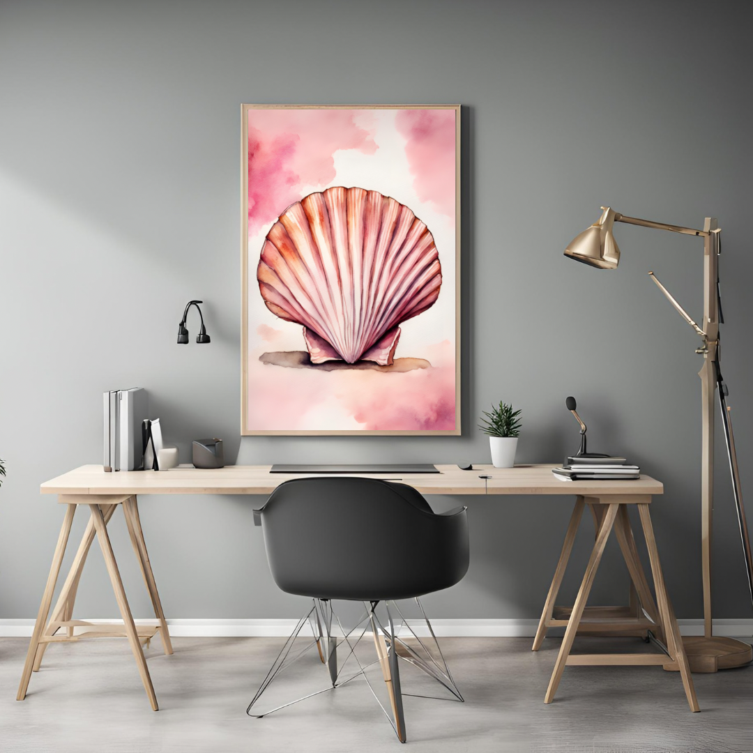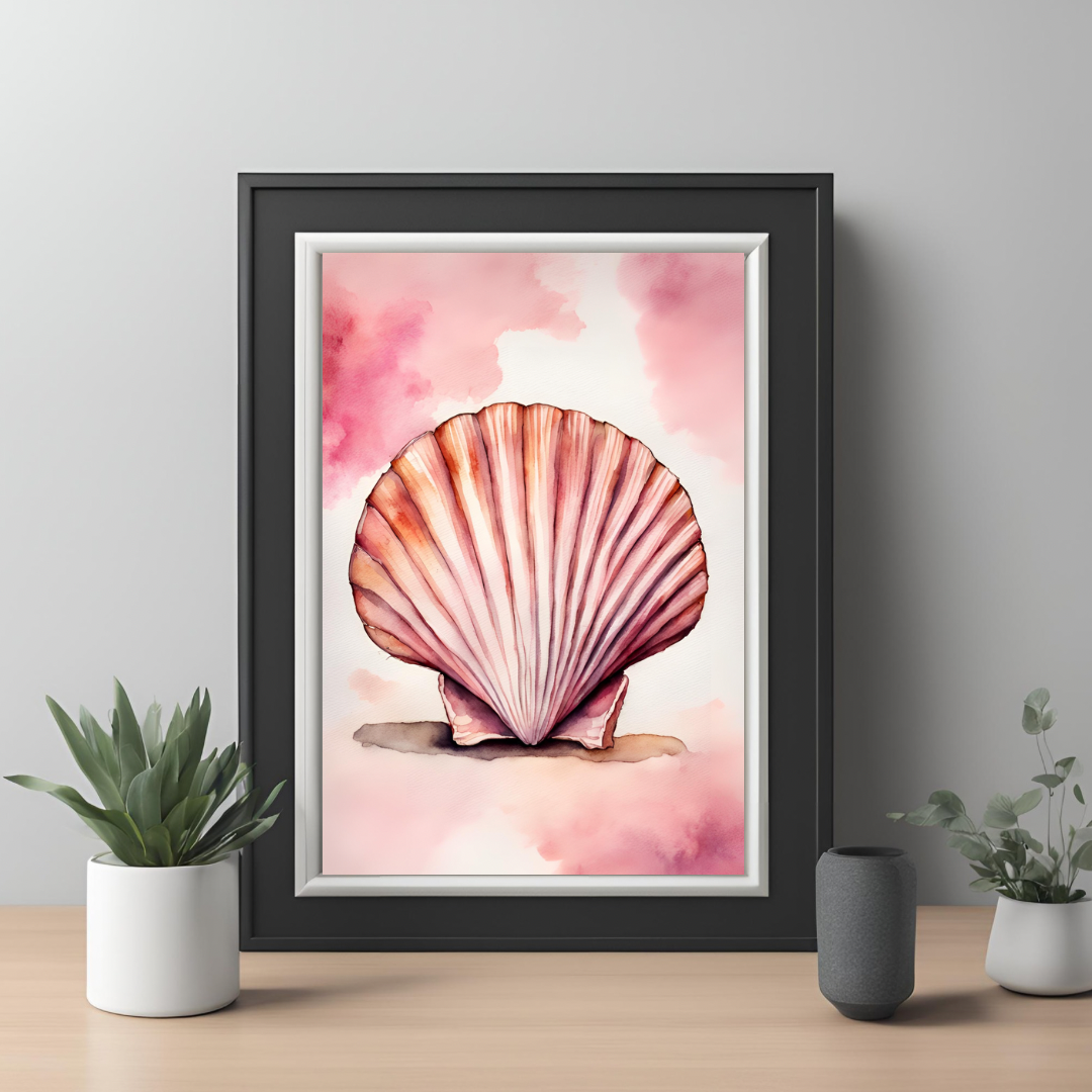 Elegant Watercolor Shell Design: The artwork showcases a soft and graceful pink shell in watercolor, offering a calming, beachy vibe. The delicate pink tones add warmth and a touch of sophistication to any room.