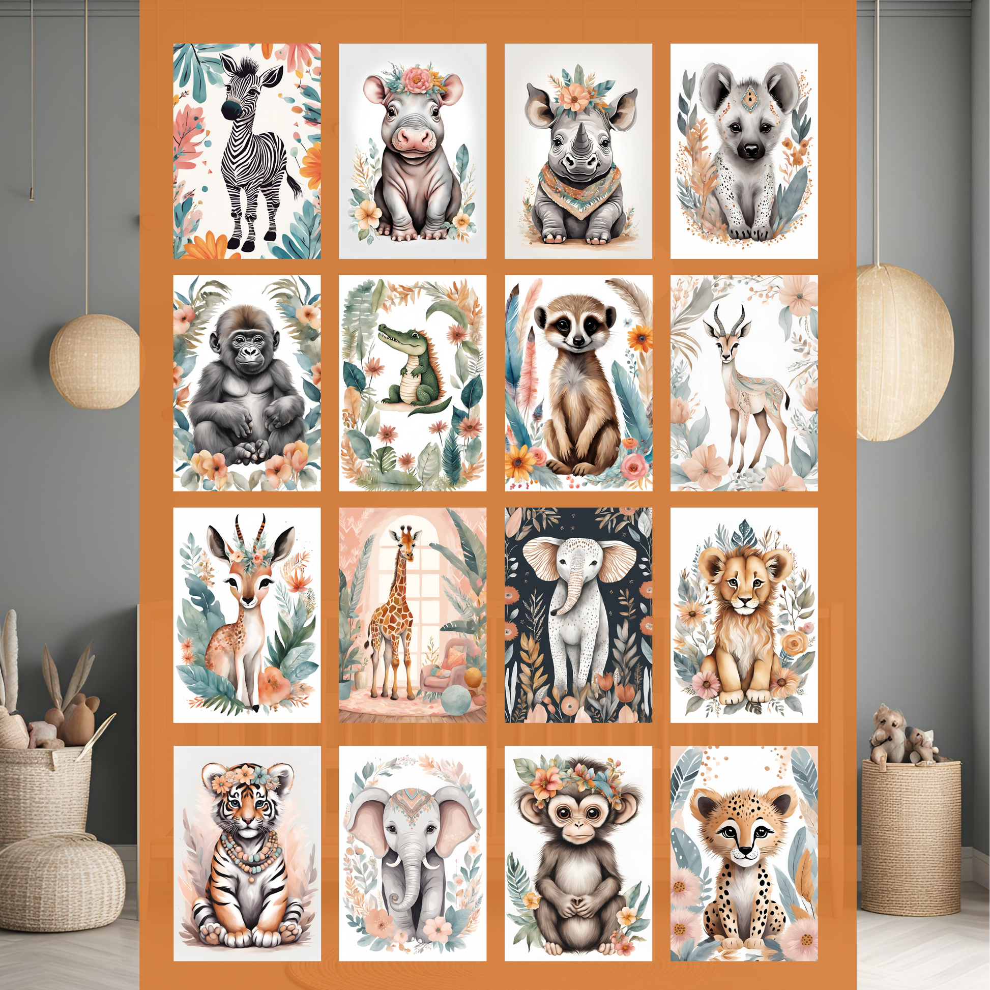 Pack of 16 Prints: This bundle includes 16 unique prints, each showcasing a different safari animal, from lions and elephants to giraffes and zebras. The variety of designs ensures there's a print to suit any part of your child's room.