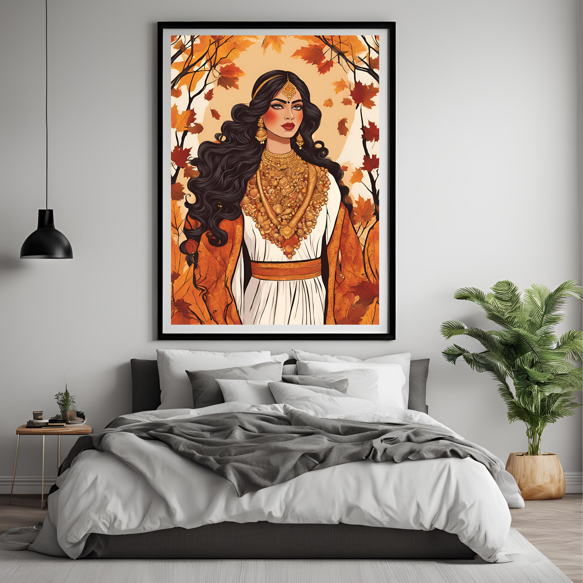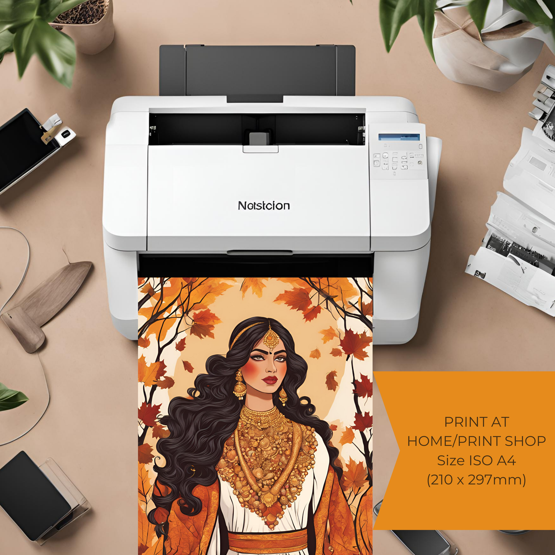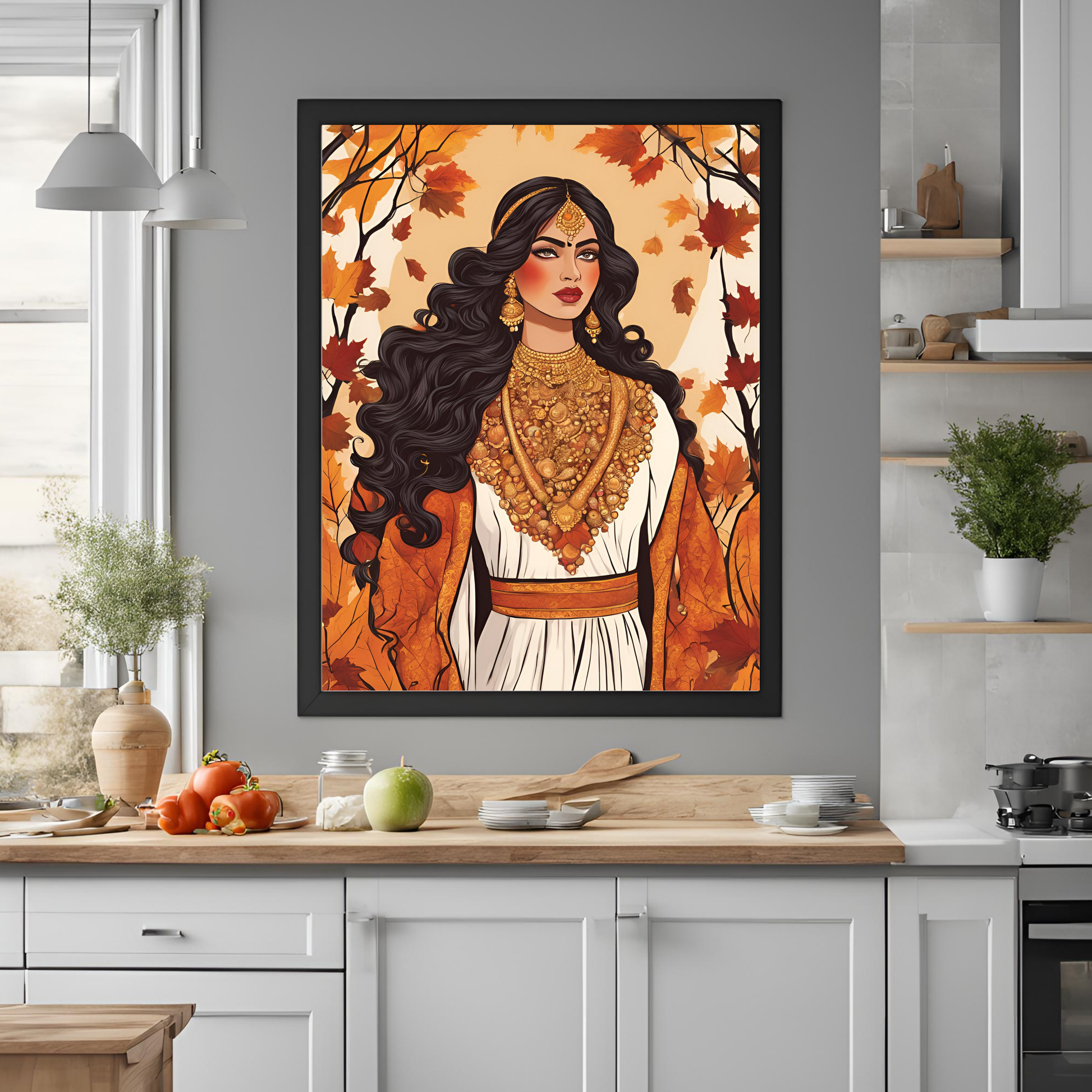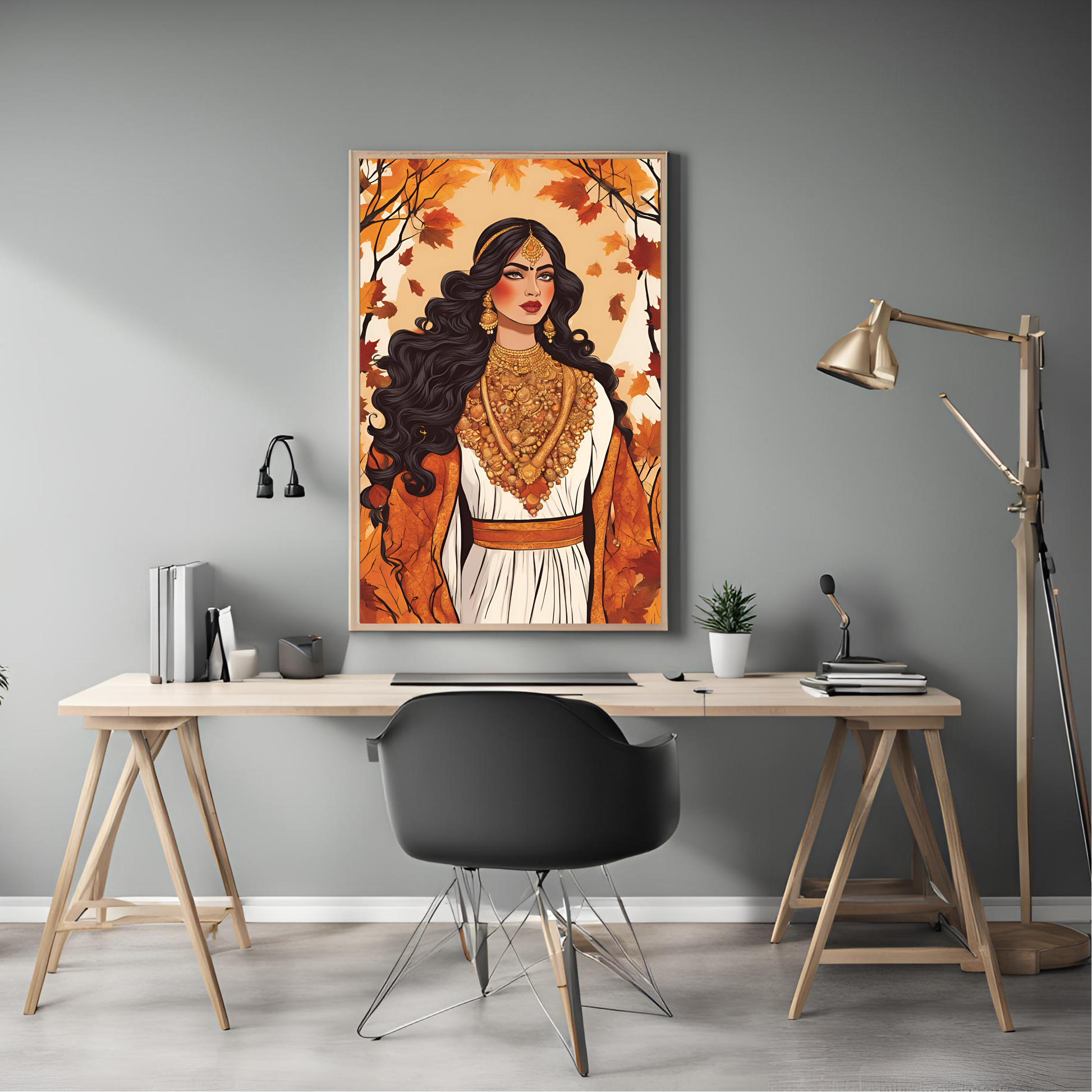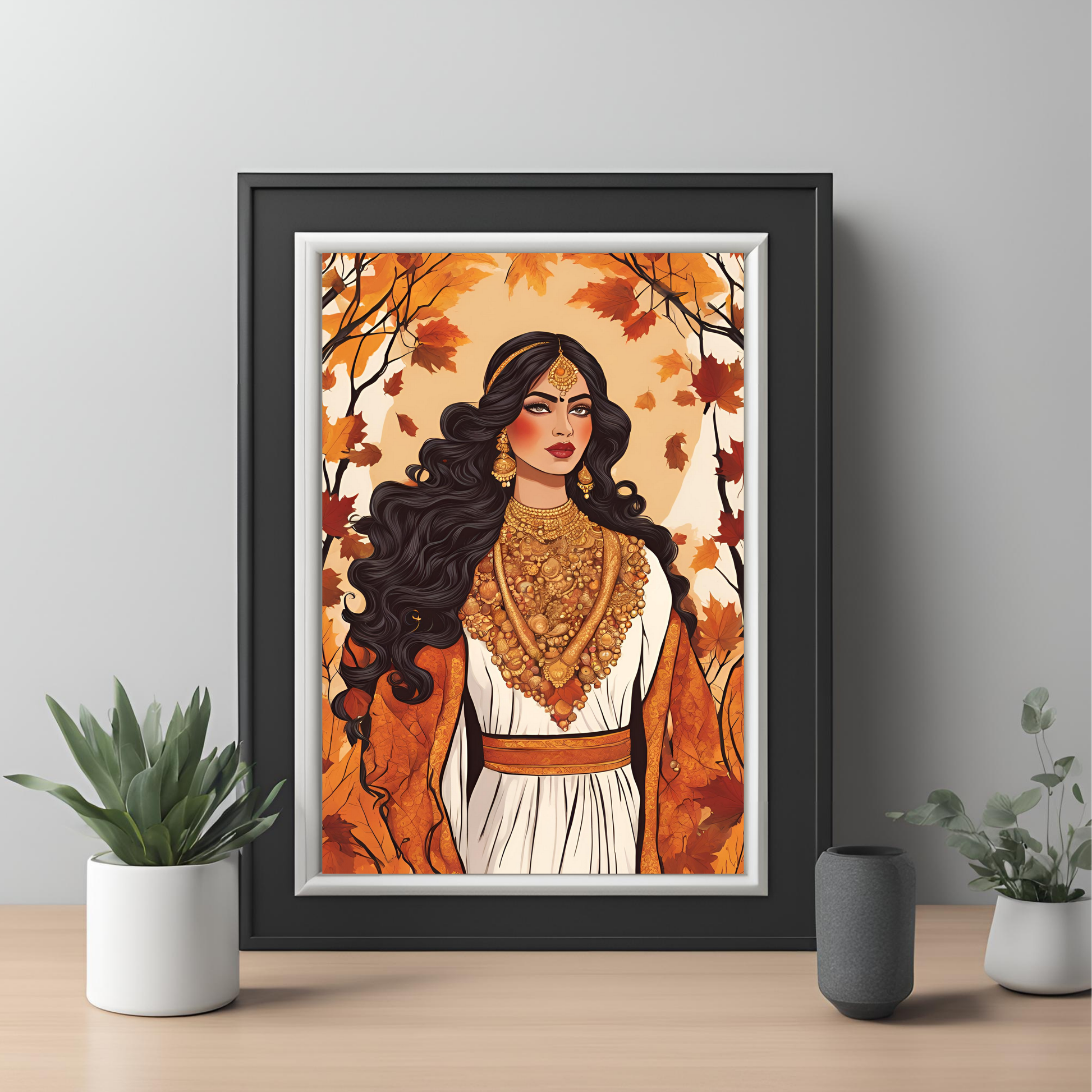 Perfect for Cultural and Seasonal Decor: This "Desi Autumn Fall Princess Digital Print" adds a touch of heritage and seasonal beauty to living rooms, bedrooms, or home offices, ideal for those who cherish South Asian art and enjoy decorating seasonally.