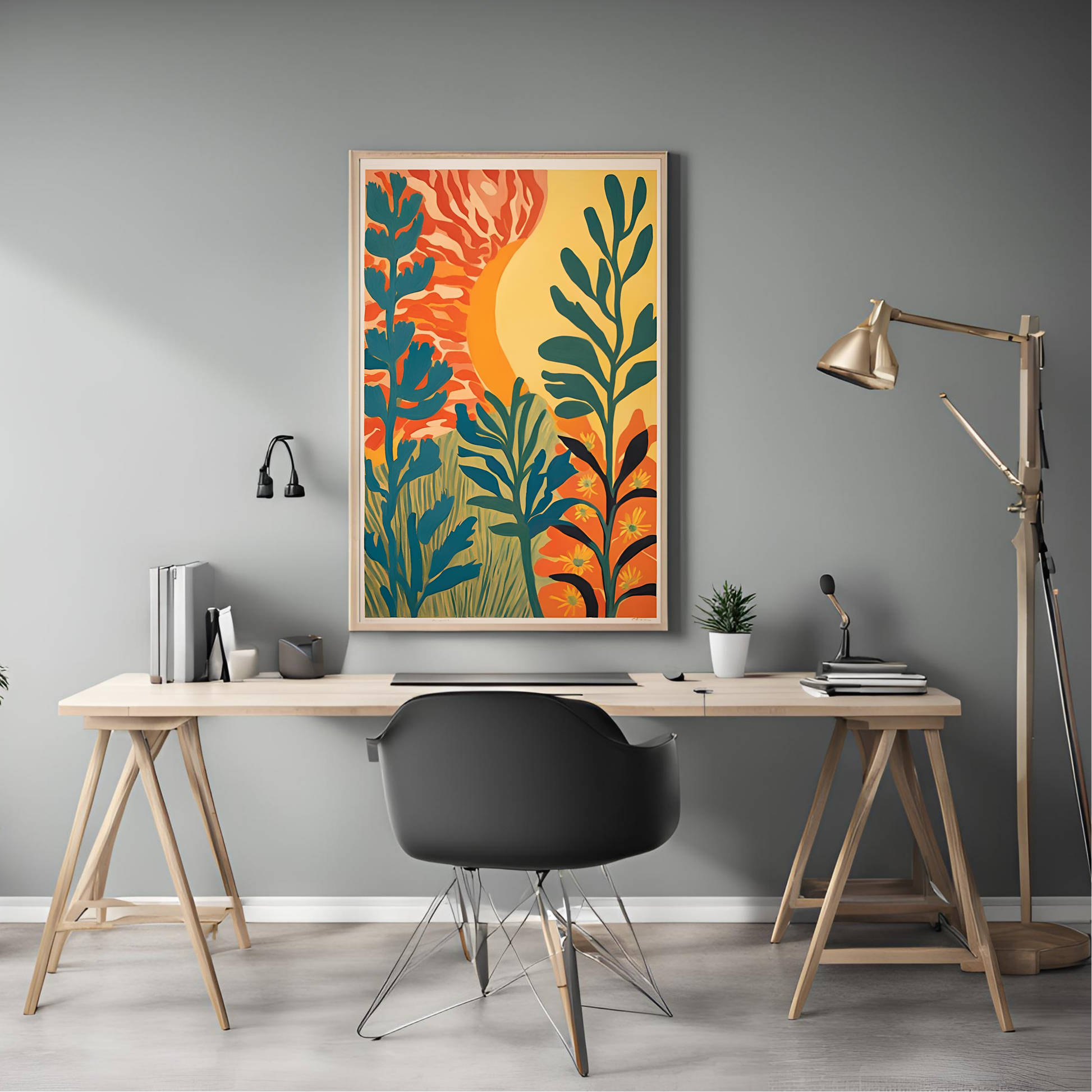 Sunset and Plant Theme: The artwork showcases a stunning sunset with rich, warm gradient colors, complemented by the striking silhouettes of plants. The mix of vibrant colors and natural elements creates a peaceful and captivating scene.